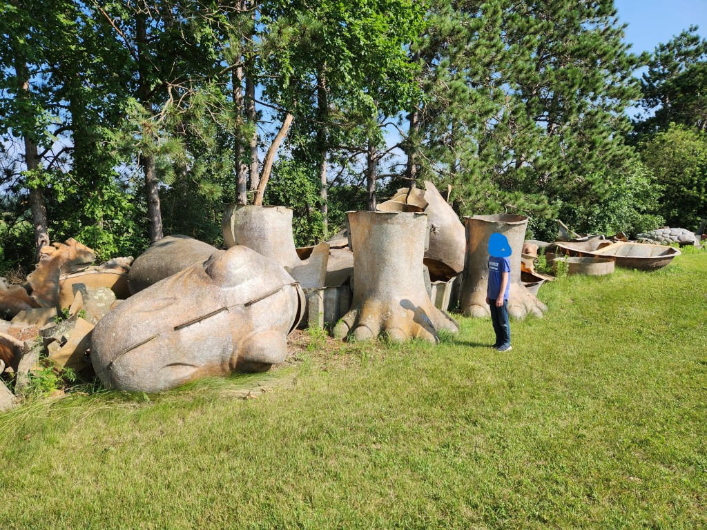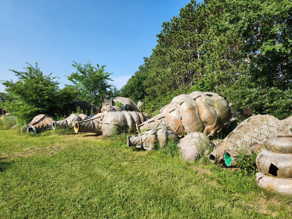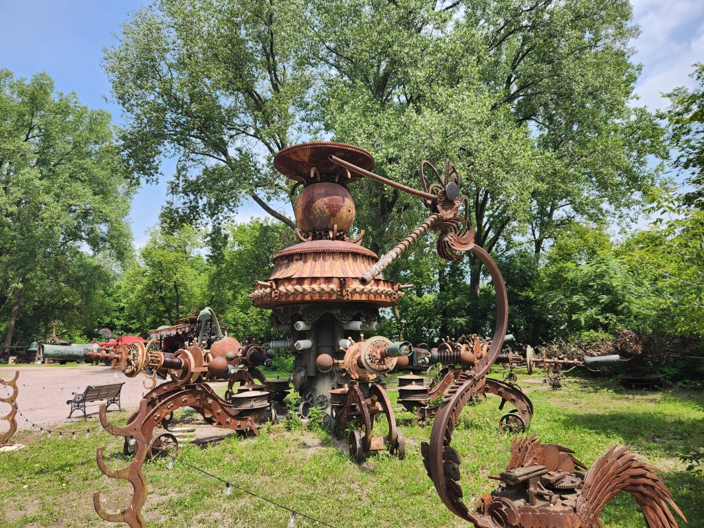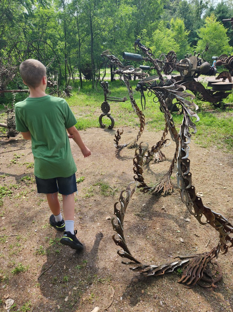 Technically, it’s a sculpture garden, a place where one man, Tom Every, wanted to have fun with scraps and junk. He’d gather old machines from power plants, lightning rods, Thomas Edison dynamos, and more to build on and on to this unique structure. While building the Forevertron, he also constructed various creatures and statues, transforming this little clearing in the North Woods into an alien landscape. Bash was especially enamored, being our crafter with scraps of cardboard, duct tape, and origami paper.