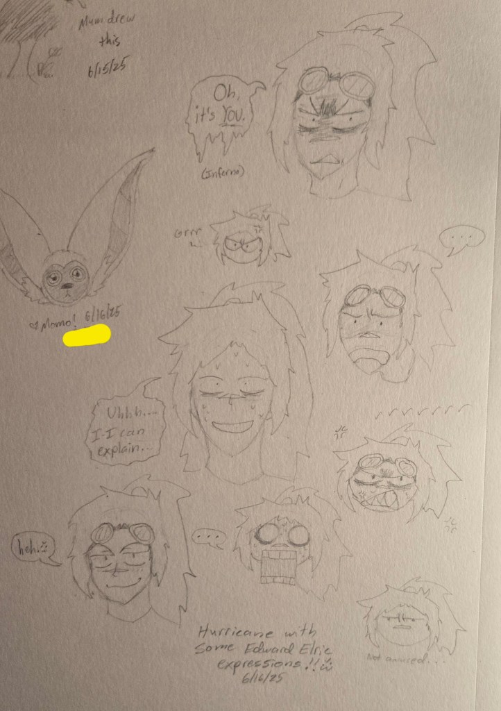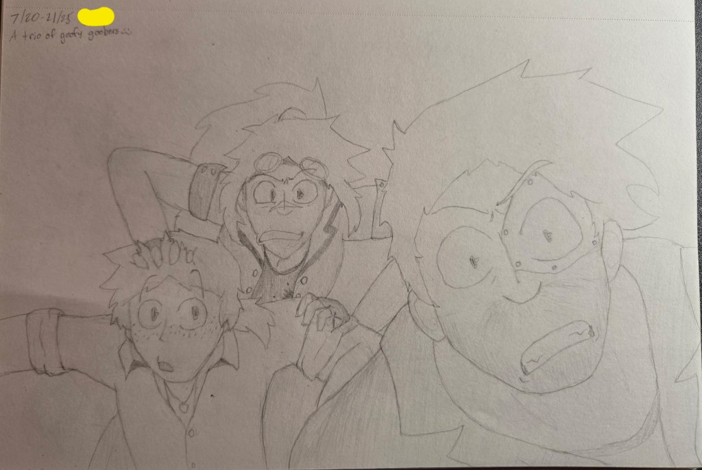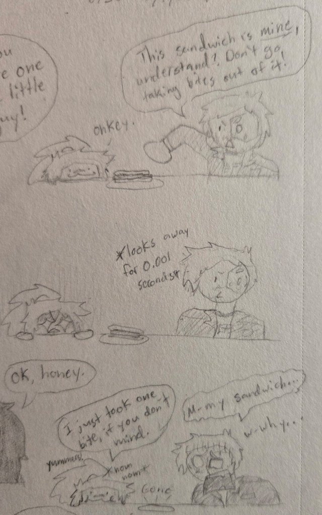 Now, how does writing stories inspire art? Well, there is definitely one example that I personally do all the time. I know how the story plays out, and what kind of events will happen to certain characters, but there’s a slight problem. It’s all in my head. Wouldn’t it be cool to actually see people do the stuff you always think about? I probably sound pretty vague right now, so I’ll give a few examples of my own little guys doing things. Now my little gang of goofy goobers definitely have endless amounts of fun interactions between them. So what I do is draw little comic-esque doodles of them messing around, mainly for my own entertainment, but also to actually see them bein’ silly. Like my character Hurricane stealing Cyclone’s sandwich when he looks away for less than a second, or my two characters Gila and Manatee bein’ all cute cuz they’re married and all.
